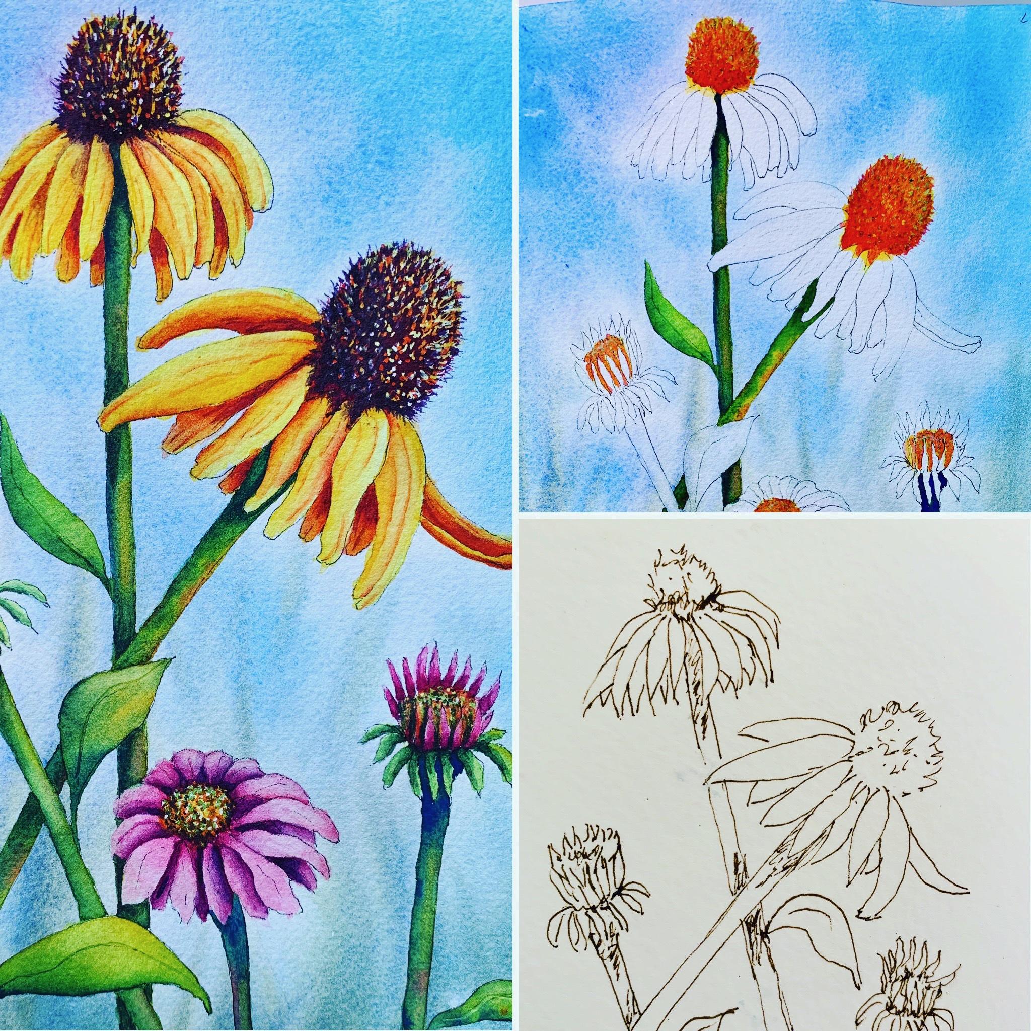 This fairly stiff demonstration emphasizes the geometry of the shape. This framework will help you capture the … Cone flowers are some of the easiest ones to. You do not always have a cute flower stamp, and you really want to watercolor, but that should not stop anyone. The shape of the ellipse of the outer edge of the cone and the location of the flower bottom are the two most important reference points to catch in your preliminary sketch.